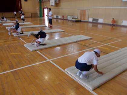 4年生の5時間目は、講堂でマット運動を学習しました。今日は、前転と後転を学習しました。体を丸めて、膝を閉じる(前転)手をついて体を押し上げる(後転)などの点に気を付けて取り組みました。積極的に取り組み、きれいに前後転できていました。