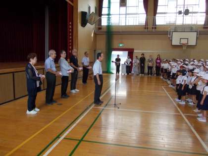 8:30分に講堂で敬老ふれあい手紙贈呈式が行われました。校長先生の挨拶、児童代表(6年生)の言葉の後、1年生から6年生の各学年1名の代表児童が地域の方々に手紙を贈呈しました。手紙は、2学期が始まってすぐに一人一枚気持ちを込めて手紙を書きました。最後に地域の方代表の言葉をいただきました。退場される時は、拍手でお送りしました。