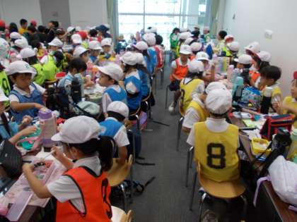 科学や文化を遊びながら学べるコーナーが集まった5Fのやってみる階や、生活体験をクローズアップしながら遊べる遊ぼう階などで、楽しんで取り組んでいました。お昼ご飯はキッズプラザで友だちと一緒に仲良くお弁当を食べました。みんな楽しんで活動していました。