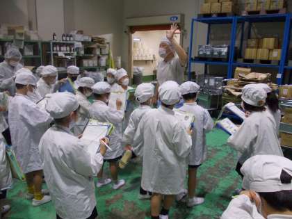 工場の2階では、ソースの作り方、貯蔵タンクなどを見学しました。一階では、機械でソースを容器に入れる部屋や梱包の様子などを見学しました。工場の方の説明にいろいろな質問をたくさんしました。工場の方から聞いたこと、見たこと、気付いたことなどワークシートに書きとめました。帰る時に、串カツソースを一つお土産にもらいました。天気もとてもよく涼しい風も吹いていました。充実した社会見学になりました。