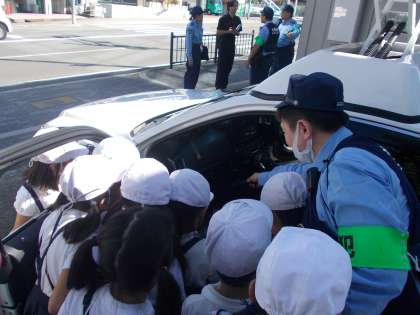 交番の警察の方々のインタビューの後は、パトカーの装備について説明してくれました。赤色灯や無線機、身を守る盾などいろいろなことについて教えてくれました。タブレットで撮影しながら話を真剣に聞いていました。交番で働いている警察の方々の工夫が町の生活を支えていることを学びました。マナーを守って活動することができました。