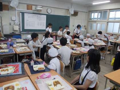 交流給食は、生活班(たてわり班)で、なごやかな会食ができるよう実施しています。4〜6人ずつのグループに分かれて給食を食べます。まずはじめに、6年生が1年生を迎えに行き、準備を進めます。そして、別の6年生が給食を取りに行き、配膳を進めます。喫食時の進行は、班長・副班長が中心に行います。なごやかな雰囲気で給食を食べました。
