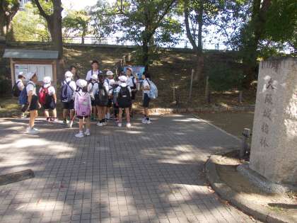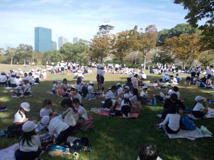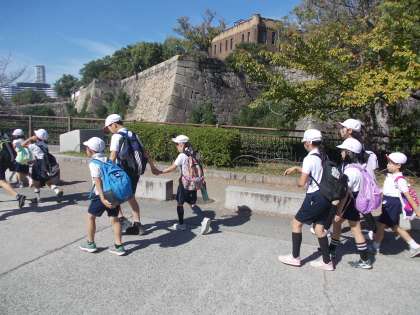 6年生が1年生と手をつないだり、1年生の歩く速さに合わせてゆっくり歩いてくれたりしてくれました。班の子どもたちの様子を見て、休みながらチエックポイントを目指していました。チエックポイントでは、先生がクイズやゲームを出しました。班で力を合わせて楽しみながら取り組んでいました。お弁当は、西の丸庭園で、班の友だちと一緒に食べました。芝生の上でおいしくいただきました。