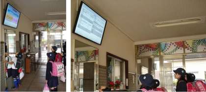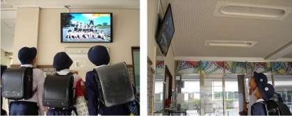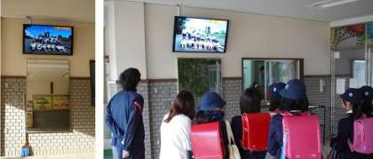 学期末懇談会で本校を訪れた保護者の皆さま方の中には、すでにご覧になられたかと思いますが、月中行事予定や先生の連絡掲示板としての活用のほか、おもちつき大会や秋の全校遠足などをスライドショーとして表示させると、子ども達から歓声が沸きあがります。