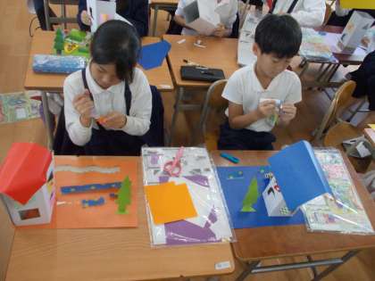 2年1組の3・4時間目は図工でした。「まどのあるたてもの」を作りました。はこ台紙にカッターナイフで窓をあけました。ぞうけいしでタワーの屋根を作ったり、かざりをつけたりしました。はさみやカッターナイフを上手に使て飾り付けをしました。色鮮やかでいろいろなたてものを作っていました。