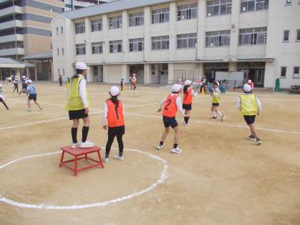 4年生の2時間目は、合同体育でした。運動場でポートボールのゲームをしました。味方の動きをよく見てパスを出し、人のいないところに動いてパスを受け取っていました。声を出してパスを受け取り、ゴールマンが取りやすいようにシュートしていました。守りは、ゴールマンとボールの間を手を上げて守っていました。とても良い動きで取り組んでいました。