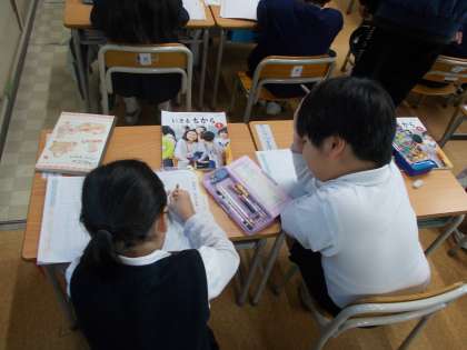 1年2組の2時間目は、道徳でした。「学校のかえりみち」を学習しました。スーパーの前でおじいさんが困っていました。ゆうととまこといちどは通り過ぎようとします。困っている人を助けることは、相手だけでなく、その喜びを感じる自分や周りの人にも大きな喜びであること気づき、身近にいる人に親切にしようとすることについて学習しました。おじいさんだけでなく、おばあさんもゆうじもまことうれしくなったことについて考えました。親切にしてうれしくなった時のことを思い出しました。