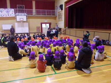 2時間目に、1年1組と和光園とアイグラン保育園の子どもたちが講堂で昔遊びを通じて交流をしました。昔遊びは、あやとり・こま・けん玉・だるまおとし・お手玉・おはじきです。1年生が保育園の子どもたちに遊び方を教えたり、いっしょに遊んだりしました。最後に、1階から3階までの校長室、図書室、理科室などの教室を順番に見て周りました。
