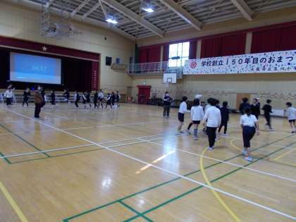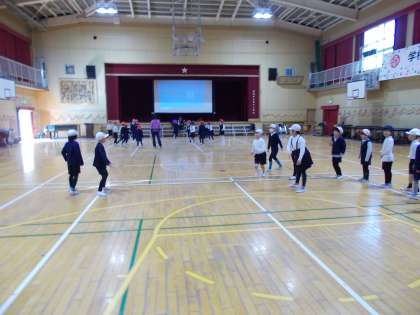 1・2時間目に講堂で、おおなわ大会でした。ルールは、跳んだ回数を数える。またいだり、通り抜けたりしても、縄の向こう側に行けば1回と数える、5分間で1番回数の多い学級が優勝です。学級のなかまと協力して8の字跳びを跳んでいました。クラスの目標に向かってがんばっていました。