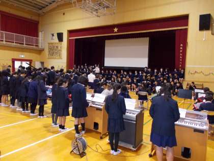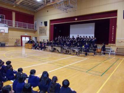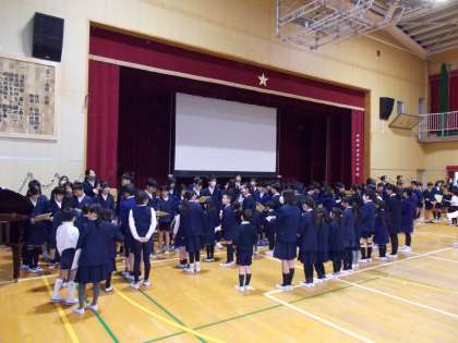 6年生への色紙(生活班の1から5年生の寄せ書き)をビリーブを歌いながら1年生がわたしました。6年生の出し物は、情熱大陸の合奏でした。迫力のある演奏にみんな拍手をしていました。最後に6年生に感謝の気持ちをこめてありがとうさようならを全員で歌いました。最後に1年生から5年生で作った花道を6年生が通りました。