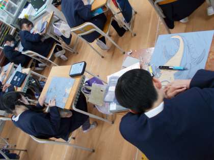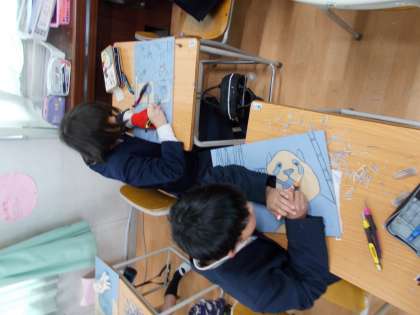 5年2組の4時間目は、図工でした。木版画に取り組みました。生きものの絵を版画にします。この時間は、板に下書きした生き物を彫刻刀で彫っていきました。いろいろな生き物を彫刻刀で彫っていました。集中して丁寧に彫っていました。