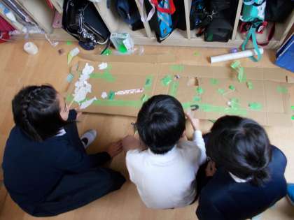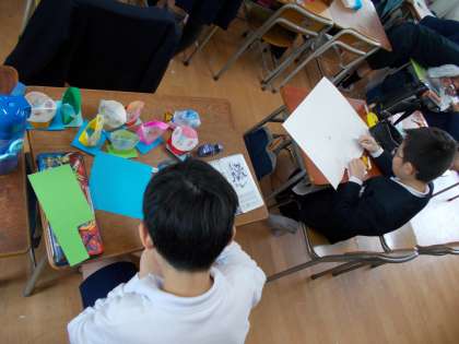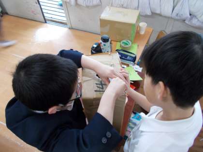 3年1組の1時間目は、理科でした。「おもちゃランド」を学習しました。これまで学習したことを生かして、友だちとかかわりながらおもちゃを制作します。作るもの、できあがり図、用意するもの、工夫したことを計画カードに書きました。磁石を使った魚つりゲームや段ボールを使った空気砲などを作っていました。友だちと一緒に相談しながら作っていました。