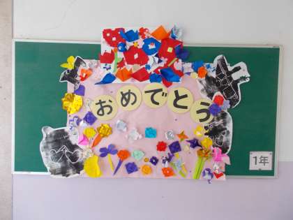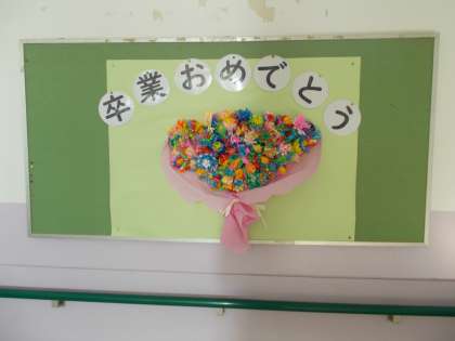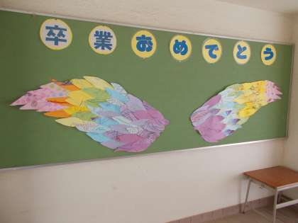 3月の1周目の後半ぐらいに、校内の各学年の掲示板に卒業のお祝いの掲示を張りました。一階なかよし学級1の教室前の掲示板には、なかよし学級の子どもたちが翼を作りました。1階3号階段前の1年生の掲示板は、1年生の子どもたちが、折り紙や版画を使って掲示しました。2号階段の2年生の掲示版では、2年生の子どもたちが、いろいろな折り紙を使って花束を掲示しました。