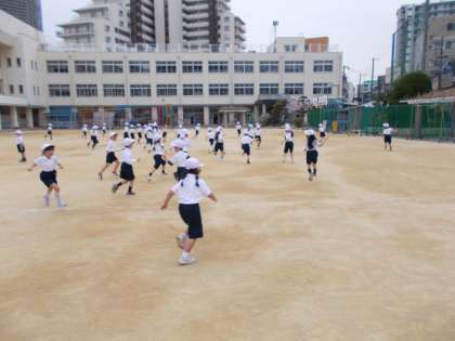 1年生の3時間目は、体育でした。始めに体操服の着替え方などを学びました。運動場では、2列の並び方をたしかめた後、鬼ごっこをしました。広い運動場を元気よく走っていました。