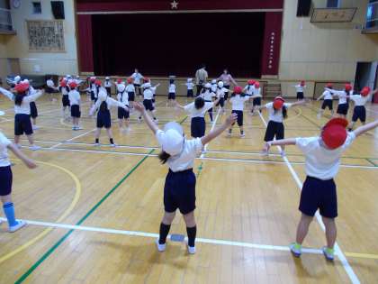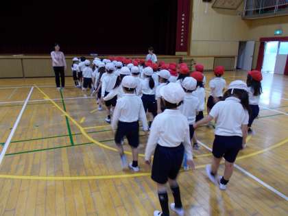1年生の3時間目は、1・2組の合同体育でした。講堂で、ラジオ体操や並び方の練習をしました。運動会の開会式や閉会式で並んだり演技の前にラジオ体操をしたりします。先生の指示をよく聞いて、早くきれいに整列できました。
