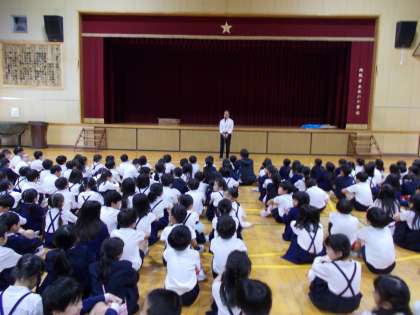 12日(月)の児童朝会は、校長先生からいじめいのちについて考える日についての話がありました。自分の行動や言動を見つめて良い行動をすることは、自分や他人の命を守る一歩につながるという話がありました。その他に登下校の通学路やあいさつについての話しもありました。