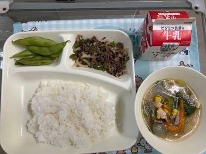 ごはん 牛乳 チンジャオニューロースー 中華みそスープ えだまめ
