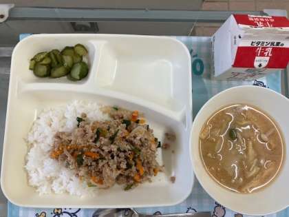 そぼろ丼は「おいしかったよ」の声を、1年生や他の学年からもをたくさん聞くことができました。また、きゅうりのゆず風味も豚ひき肉の丼とよく合い好評でした。