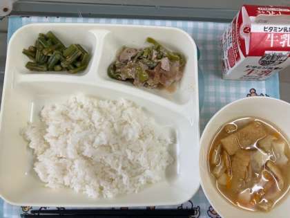 豚肉の梅風味焼き 五目汁 三度豆のごまあえ ごはん 牛乳