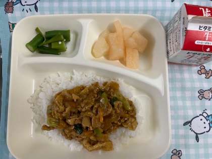 和風カレー丼 オクラの甘酢あえ 和なしカット缶 牛乳