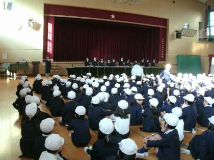 2月19日、朝の集会にてトーンチャイムの演奏会が行われました。先日の福島区こども文化祭にて好評を博した演奏です。全校の児童たちは、その柔らかく響く幻想的な音色にしっとりと聴き入っていました。