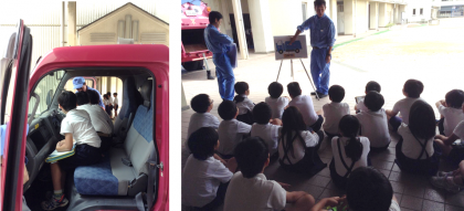 最後に運動場に出た子ども達は、パッカー車乗車体験として運転席よりメロディー♪ボタンの操作や、ゴミ収集の回転受け入れ口の稼働の様子を近くで見た子ども達は、