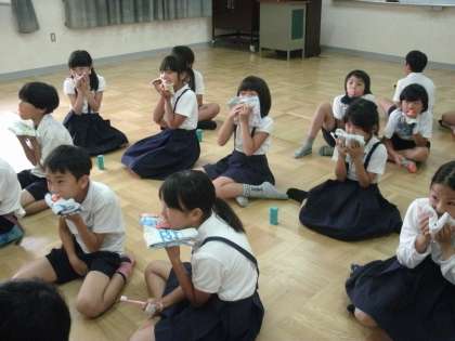 まず、それぞれの教室でむし歯のお話や正しい歯みがきの仕方を聞いて、フッ素を塗る準備をしました。