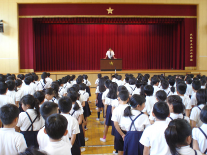そのあと、夏休みの生活についてのお話や夏休みのプール説明を聞いたあと、みんなで玉川小学校の校歌を歌って講堂での終業式を終わりました。