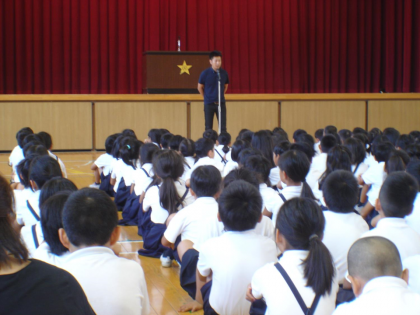 9時開始の予定でしたが、さすが、玉川小学校の児童です。5分前には講堂に集まり、静かに待っていました。特に高学年の態度が立派でした。