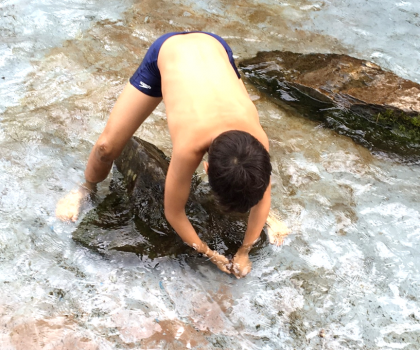 焼き板すす落としの後は『アマゴつかみ』です。