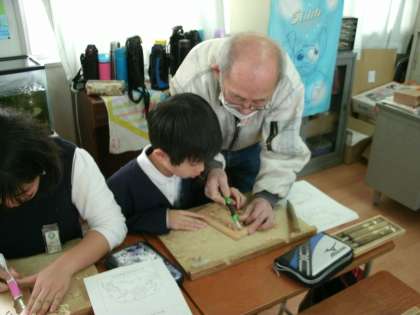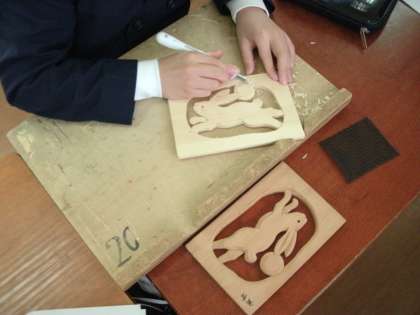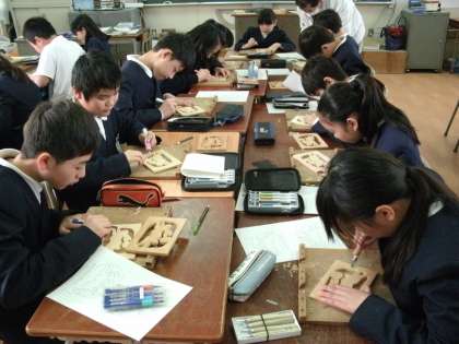 2月2日(木)学年休業で延期になってていた出前授業を、やっと行うことができました。大阪らんまの方々に来ていただき、大阪の伝統工芸である「らんま」を実際に彫って学びました。
