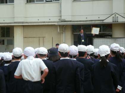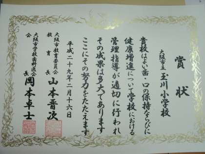 先日行われました「大阪市学校歯科医師会研究大会」で、賞状をいただきました。月曜日の児童朝会で校長先生から児童たちに、その報告がありました。1日3回・食後30分以内に・3分間の歯みがきをしましょうという、よい歯・口にまつわる“3つの3”についてのお話もありました。玉川小学校の児童たちは、とても歯がきれいな子が多いです。大人の歯に生え変わる時期にしっかり歯を磨く習慣をつけて、よい歯を守っていきましょう。