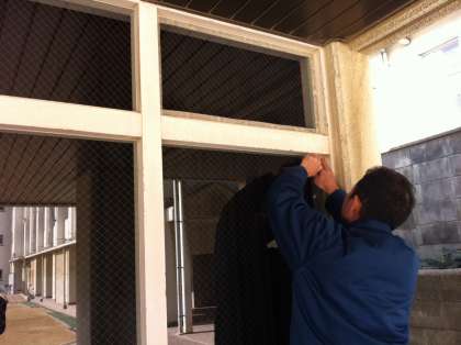 卒業式に向けて、講堂玄関入口の塗装を行います。