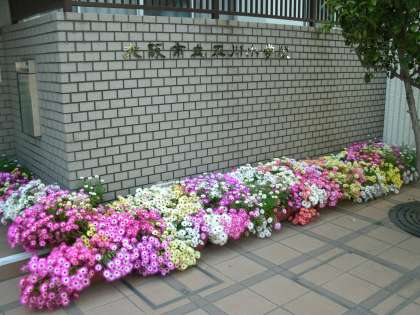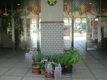 玄関に飾ってある、藤の鉢植えもきれいに咲いています。玄関前は、管理作業員さんが育てた花でいっぱいです。