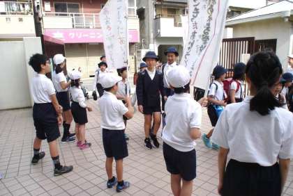 各委員会の児童が登校門の前に立ち、手作りの旗・おそろいのタスキをかけ、元気よくあいさつをしています。