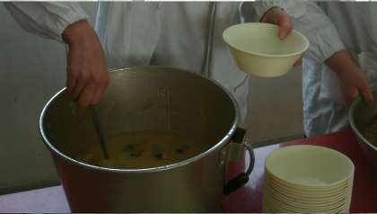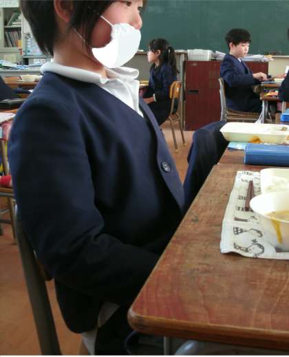 給食の時間には、給食当番が食事を盛り付けます。みそ汁の具がみんなに行きわたるよう、かき混ぜてから食器に盛り付けています。よい食べ方の一つに姿勢をよくすることがあります。