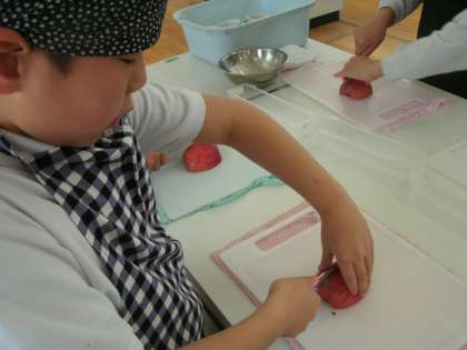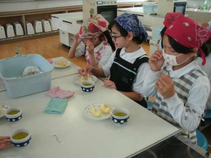 初めてのりんごの皮むきに、緊張しながら一生懸命取り組む姿がみられました。自分たちで用意したお茶とりんごは格別だったようです。「家でも挑戦してみよう!」という声もあり、これからが楽しみです。