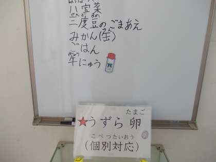 八宝菜では、うずら卵を取り除いた食物アレルギー個別対応給食も実施しました。実施に当たって給食室では、給食調理員さんと栄養教諭が細心の注意を払って連携しながら取り組んでいます。また、学校全体でも注意しながら、安全でおいしい給食を心掛けています。