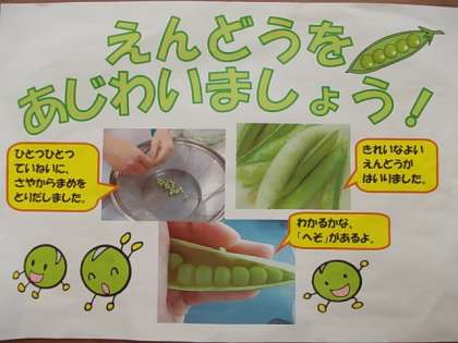 今日の給食で、えんどうの卵とじが登場しました。えんどうは、春から初夏の味が格別です。給食調理員さんが、一つ一つ丁寧にさやから豆を取り出して、調理してくださいました。