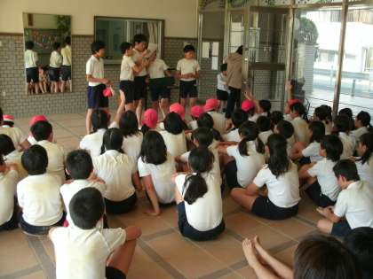 5月29日(木)運動会練習も残すところあと1日となりました。昨日から、少し気温が上がってきました。本番も、暑くなるとの予報が出て少し心配しています。今日、5.6年は赤白に分かれ、騎馬戦の作戦をたてました。運動場には万国旗も張られ、気分も盛り上がってきました。