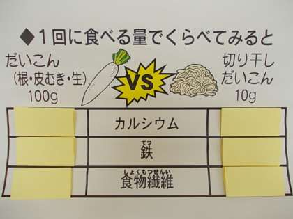 切り干しだいこんは、干すことによってさまざまな成分が増え、うま味も凝縮されます。特にカルシウム・鉄・食物繊維は、生の大根に比べて効率良く栄養素を摂ることができるようです。