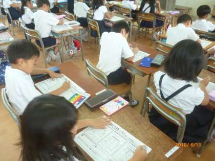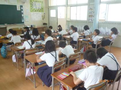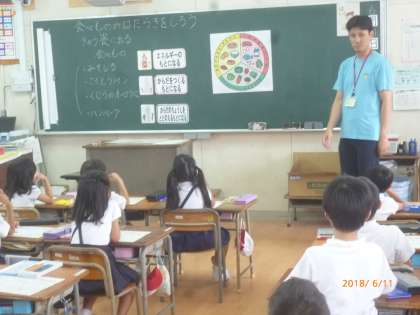2年生での栄養指導の様子です。今日の朝会では、栄養教諭の先生から「食」についてのお話がありました。