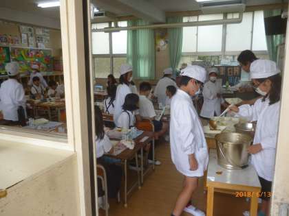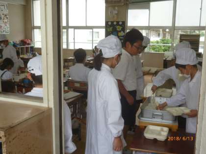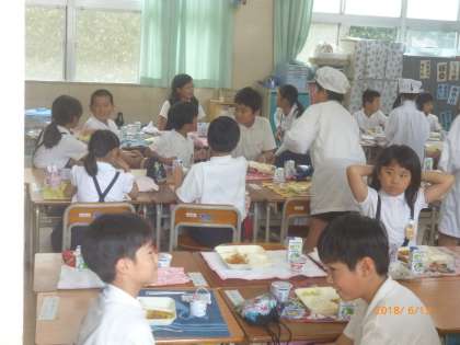 生活班での交流給食の様子です。生活班は、1〜6年生の異学年の集団です。
