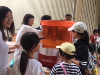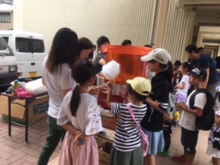 学校は、綿菓子と輪投げのお店に協力しました。綿菓子屋さんの様子です。