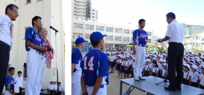 翌日には、PTAの選手代表として児童朝会の場で伝達式を行い、熱い想いを語っていただきました。