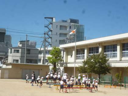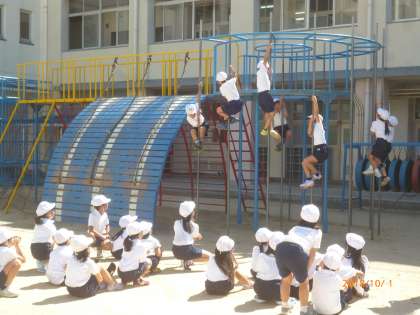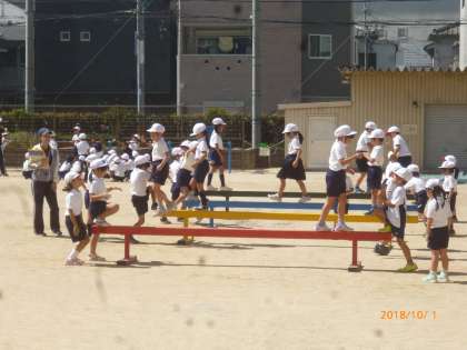 1年生が運動場で体育をしている様子です。みんな元気です。