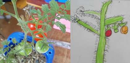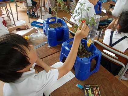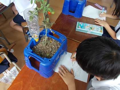 生活科で自分たちが育てたミニトマトを観察しました。自分と身近な自然とのかかわりに関心をもっている様子でした。