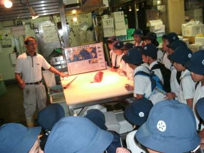 その隣でマグロの解体を見せてもらいました。30キログラムのマグロを5枚におろしてくれました。頭や骨を取り除くと20キログラムなるそうです。
