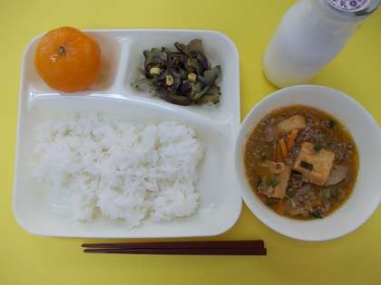 今日の献立は、トマトのマーボーあつあげ、ゴーヤととうもろこしとなすのガーリックソテー、冷凍みかんでした。子どもたちがゴーヤを食べられるかどうか心配していましたが、よく食べていました。特に1年生は、3クラスとも給食の容器が空っぽになっていました。
