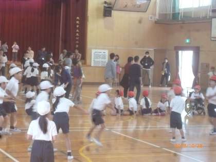 1年生は昔遊び、2年生は体育館でドッジビーをしました。